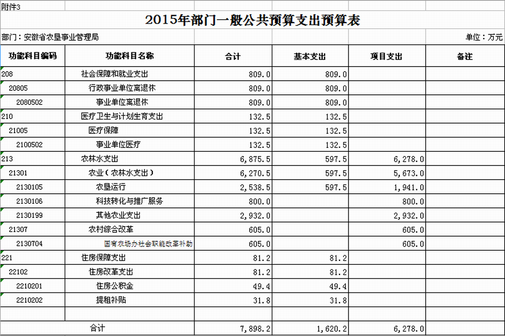 安徽省农垦事业管理局2015年支出预算7898.2万元,其中:基本支出1620.2万元,占20.5%,主要用于保障机构日常运转、完成日常工作任务等;项目支出6278万元,占79.5%,主要用于农垦系统行政事业机构的正常运转,社会管理职能的落实;确保垦区防汛抗灾的胜利,农垦社会的稳定;以及农田水利等基础设施建设支出等。