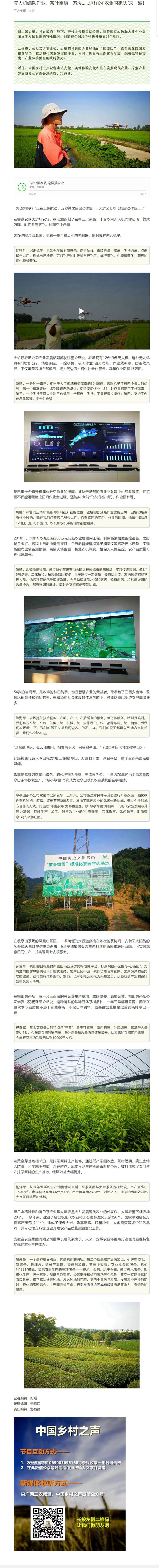 8月26日早上7点30分,中央人民广播电台中国乡村之声报道了安徽农垦集团公司无人机植保和高效茶园的情况,该报道由央广新闻记者纪翔采写。