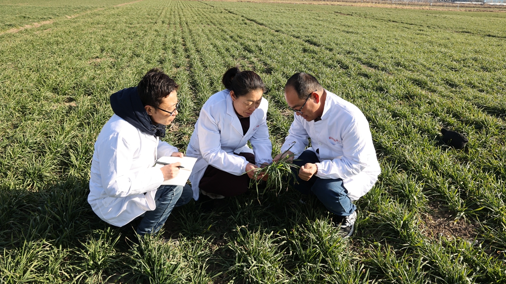元月上旬,龙亢农场农业科技创新中心科技人员深入田间,开展极寒天气条件的小麦苗情调研,记载小麦生长数据。(李 峰  摄)