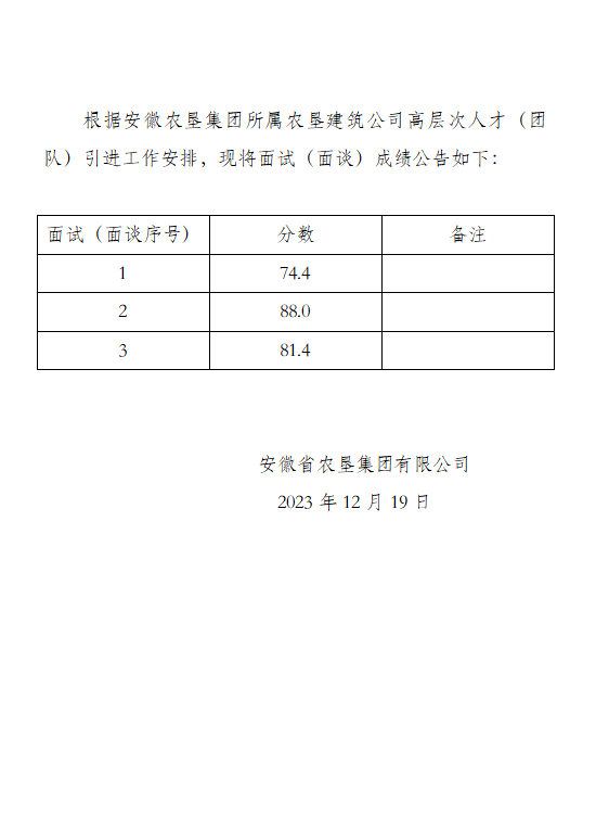 安徽农垦集团所属农垦建筑公司高层次人才引进面试(面谈)成绩公告