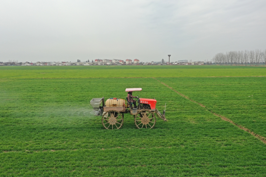 2月5日,安徽农垦潘村湖农场,职工正在农技人员指导下开展追施小麦返青肥作业。