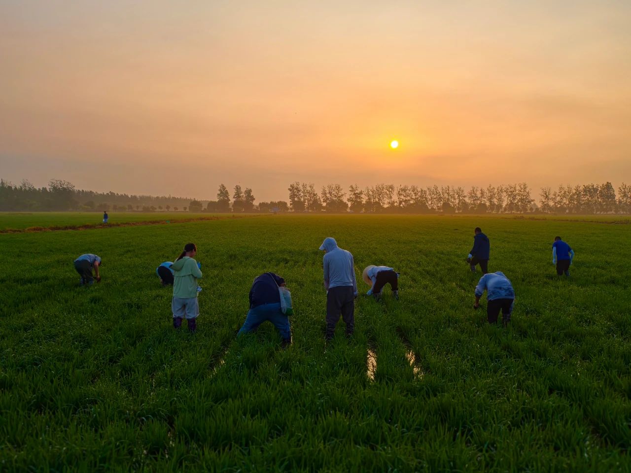 7月17日清晨5点多,天刚蒙蒙亮,大圹圩农场“千亩方”示范田里已是一片忙碌。农场近30名管理人员正在深一脚浅一脚地踩进水田,弯腰拔除自生稻