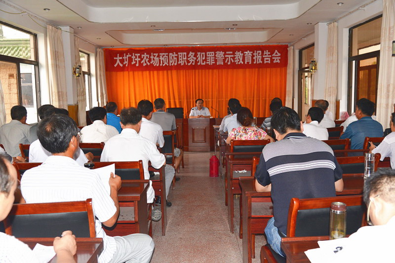86下午,大圹圩农场、天长检察院领导共同为检企共建揭牌,随后举行了预防职务犯罪警示教育报告会,农场50余名管理干部现场听取了报告。陈仪堂在报告中深入讲解了职务犯罪概念、主体及产生原因,预防职务犯罪的八大风险五大关系及工作建议,以案说法阐述了相关法规条款。汪登松在报告会总结时强调指出,农场各级管理人员尤其是领导干部要在思想上勤自警、工作上常自律、生活上多自重、作风上重自励,始终保持艰苦奋斗、勇于开拓的农垦传统和为民务实清廉的政治本色,努力提高拒腐防变的能力;各部门各单位要建立健全职务犯罪预防体系,增强防范工作实效,加强干部职工教育,从源头上预防和减少职务犯罪案件的发生,努力营造和谐稳定、风清气正的企业发展环境;全场上下要深入学习贯彻梁卫国副省长84调研农垦改革发展时的重要讲话精神,进一步认清形势,解放思想,大胆创新,充分调动各方面积极因素,优化整合各类资源,切实增加职工收入,加快农场转型发展。(余峰平)